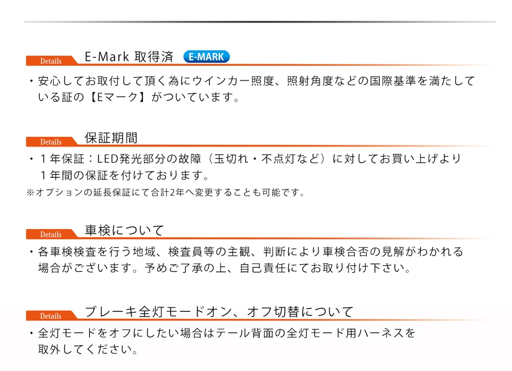 - 車検について:本製品はのE-mark取得済みの保安基準適合商品です。車検に関しましては各都道府県の検査官/検査員(有資格者)様の主観、判断により対応外となる場合も御座います。