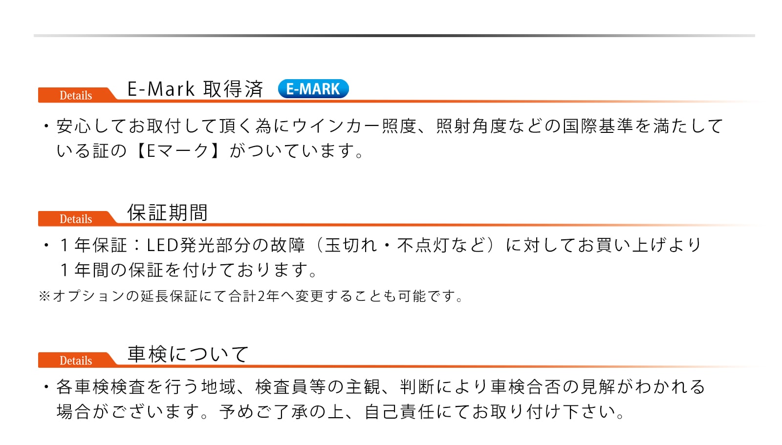 - 車検について:本製品はのE-mark取得済みの保安基準適合商品です。車検に関しましては各都道府県の検査官/検査員(有資格者)様の主観、判断により対応外となる場合も御座います。