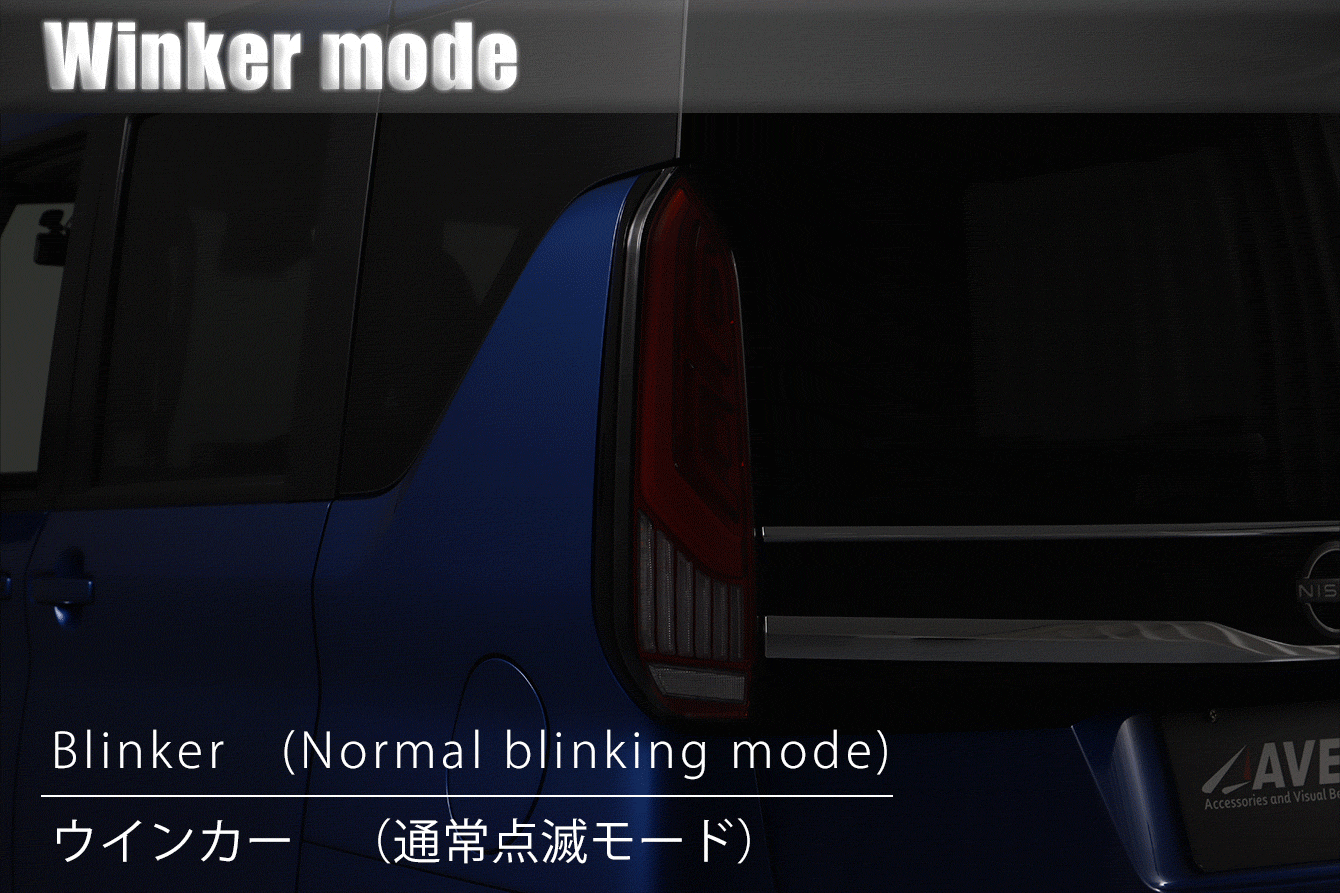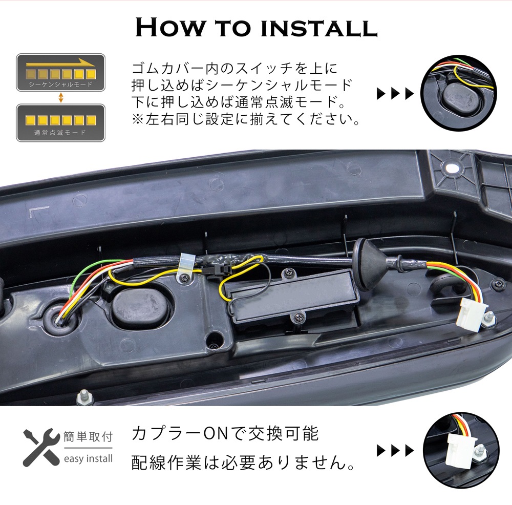 - 流れるウインカーモードと、通常の点滅モードの2タイプ。製品背面のスイッチで切り替えが可能。