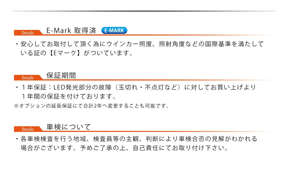 - 車検について:本製品はのE-mark取得済みの保安基準適合商品です。車検に関しましては各都道府県の検査官/検査員(有資格者)様の主観、判断により対応外となる場合も御座います。