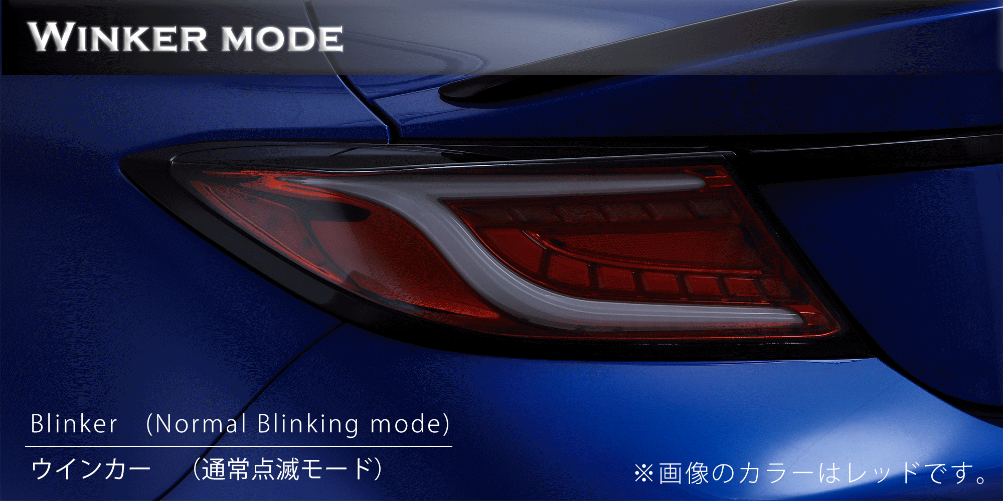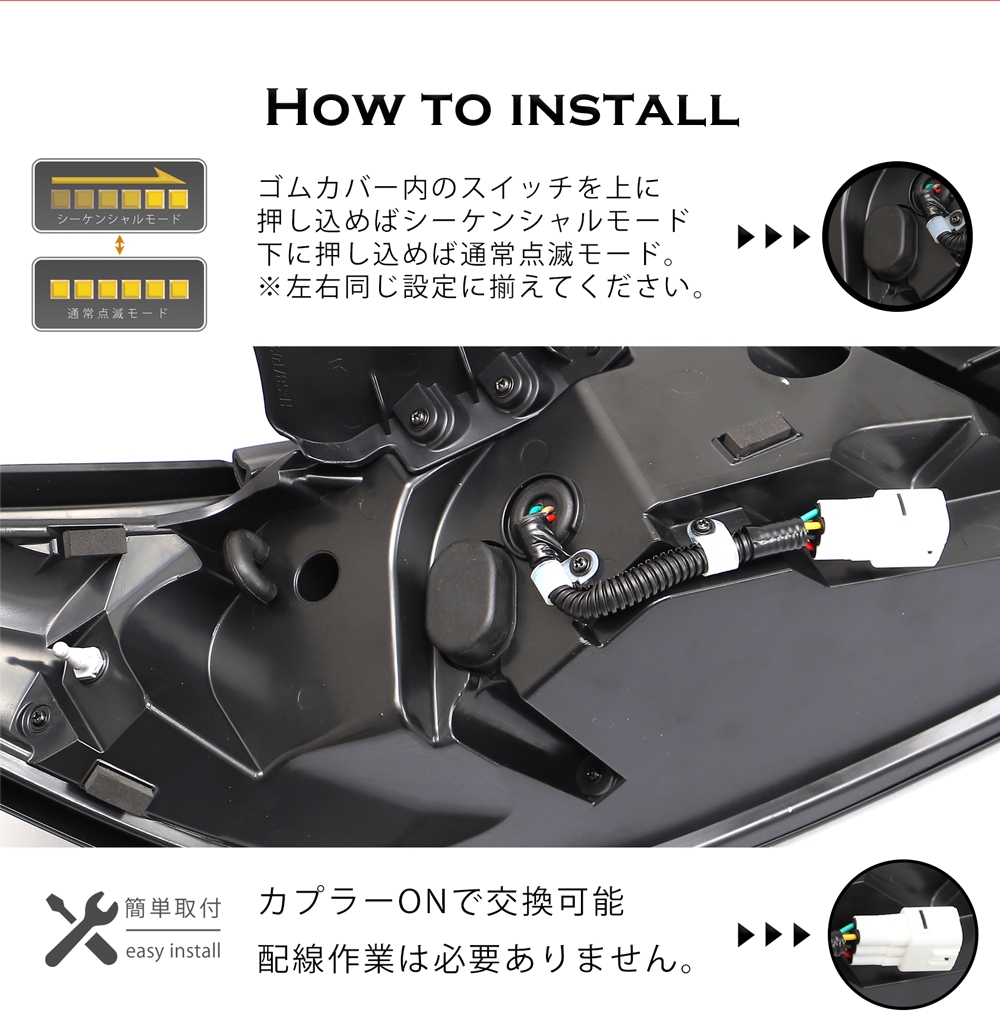- 流れるウインカーモードと、通常の点滅モードの2タイプ。製品背面のスイッチで切り替えが可能。